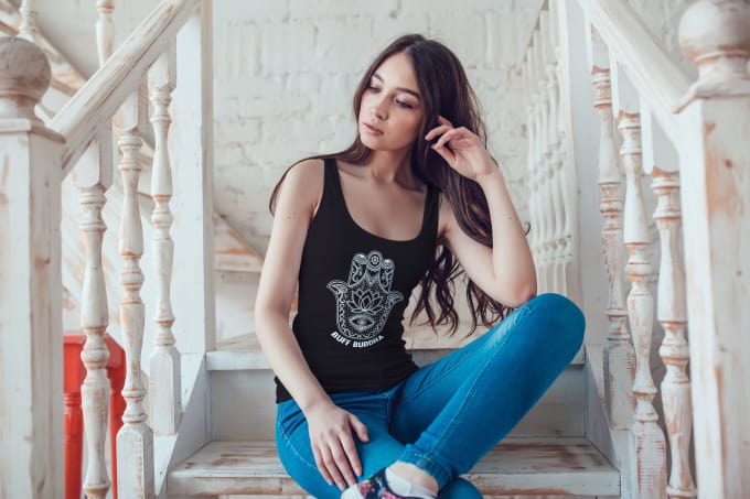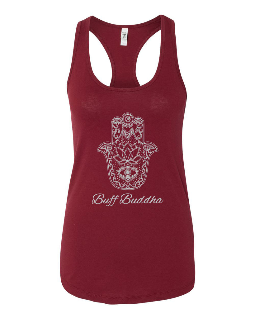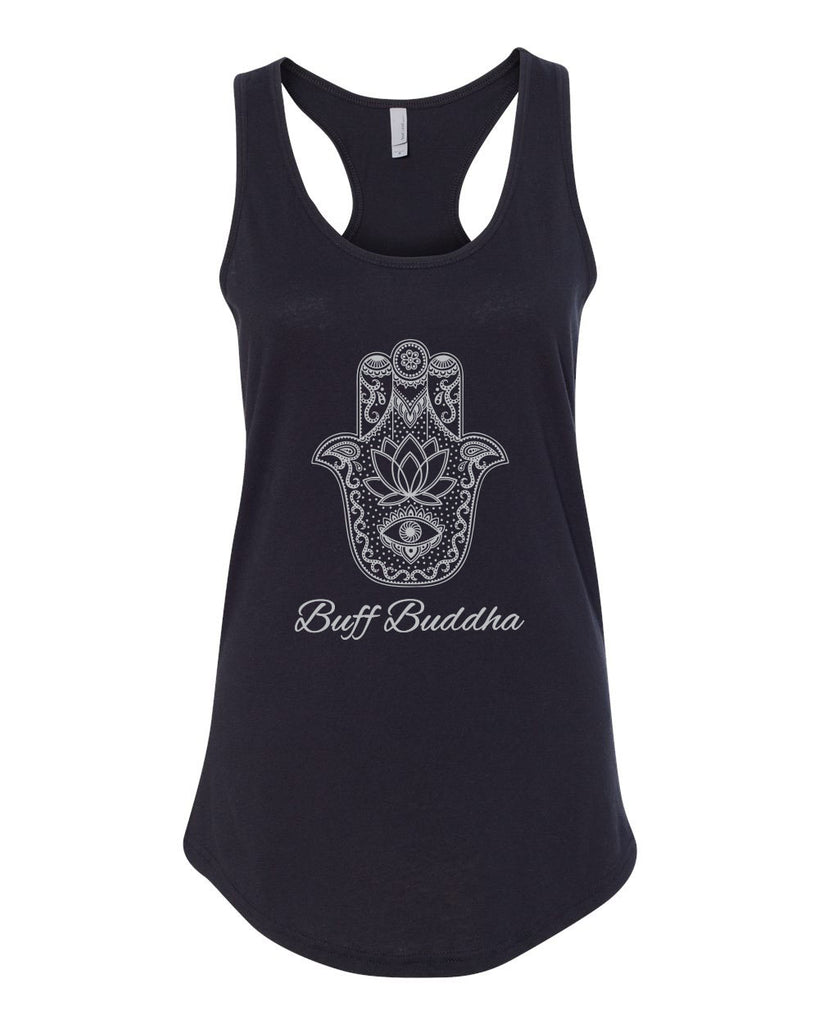 This yoga top has a little of everything. The Hand of Fatima yoga design appears as the palm of a hand and the hamsa is a popular symbol derived from the five fingers on the hand. Its 100% cotton delivers soft, comfy and flattering natural look at the coffee shop as it does in the yoga studio.